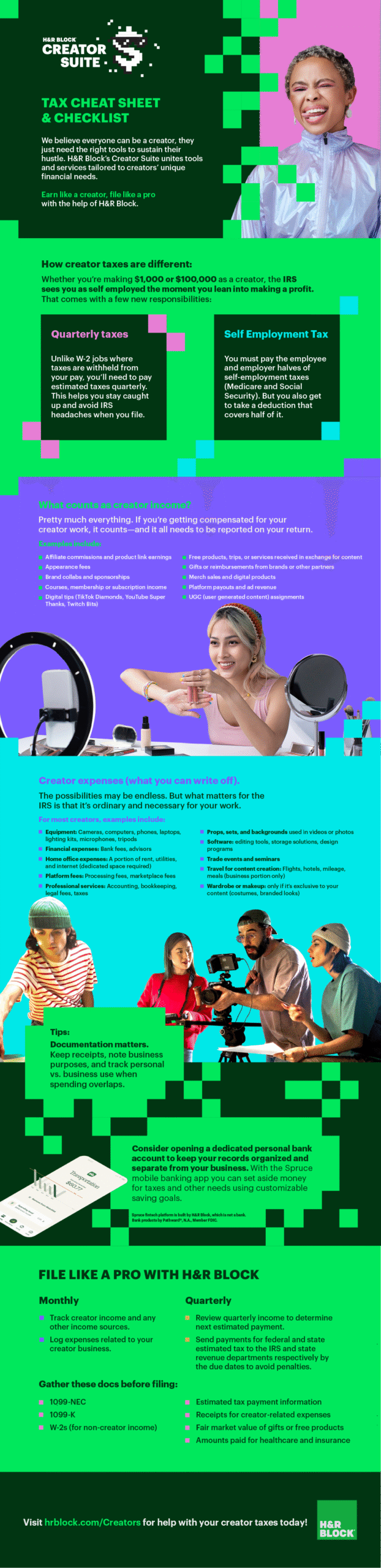 Creator taxes can feel overwhelming—multiple income streams, complicated deduction rules, and forms you’ve never heard of. But you don’t have to tackle it alone. H&R Block understands the unique financial world creators navigate every day, and we’re here to make filing simpler, clearer, and way less stressful.