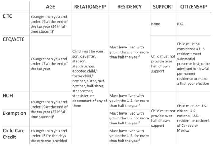 IRS Definition for exemptions, child tax and additional child tax credit, head of household filing status and the child and dependent care credit