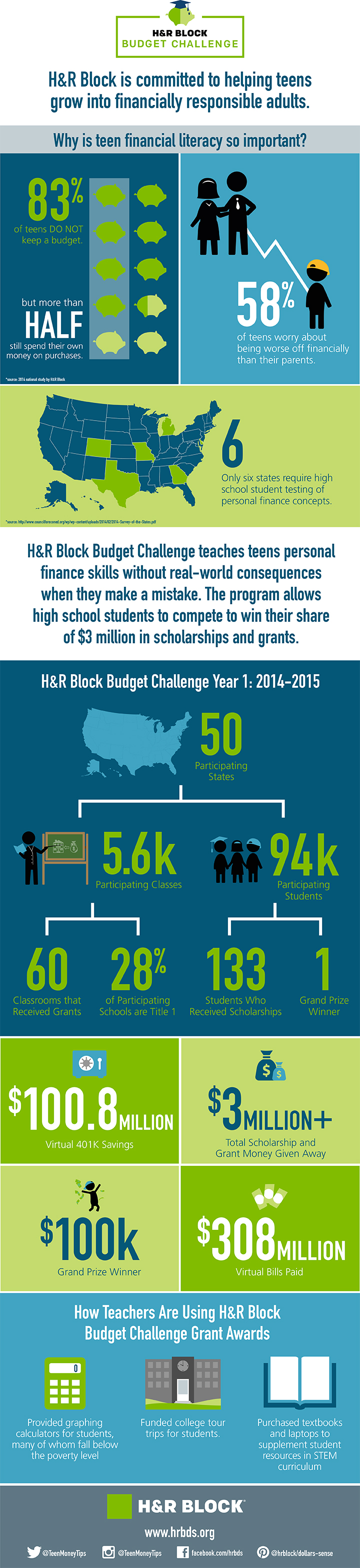 In its inaugural year, the H&R Block Budget Challenge reached more than 90,000 students in all 50 states, with participating students saving almost $100 million in 401ks and paying more than $300 million in bills in the virtual simulation.