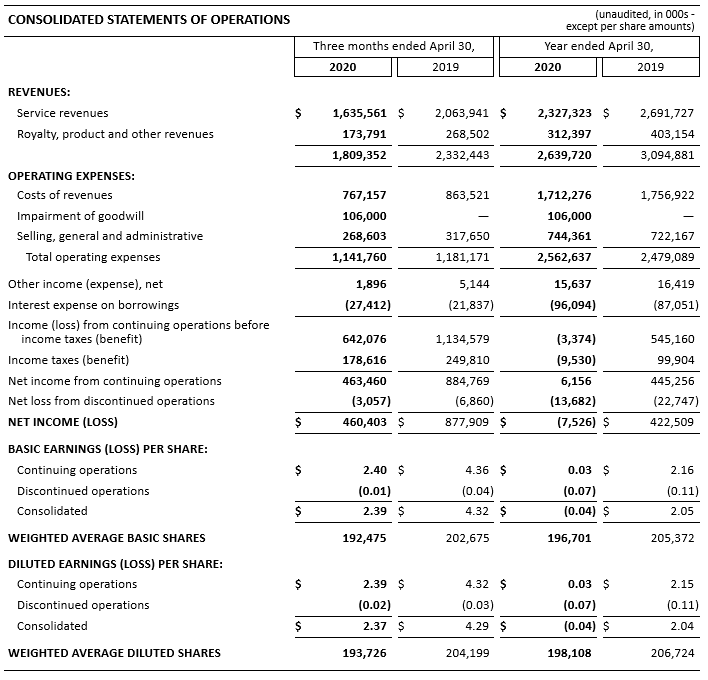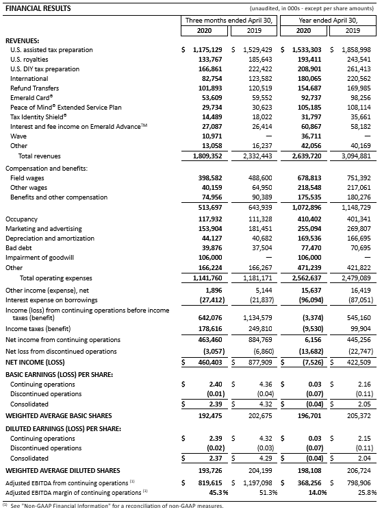 KANSAS CITY, Mo. – H&R Block, Inc. (NYSE: HRB) today released its financial results for the fiscal year ended April 30, 2020, and provided an update on its response to the COVID-19 pandemic.  The pandemic, along with the related extension of the U.S. federal tax filing deadline from April 15th to July 15th, resulted in lower revenue and earnings compared to the prior year.
