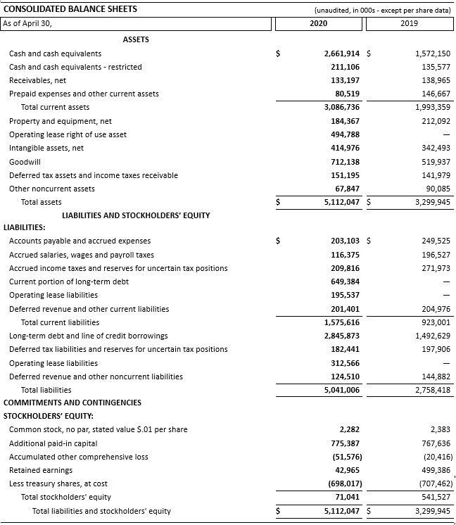 The company ended the fiscal year with $2.7 billion in cash, including $2.0 billion from its line of credit, which remains fully drawn.  The line of credit is subject to various conditions, including a covenant which requires us to maintain a debt-to-EBITDA ratio of 3.5 on April 30 of each year.  The company did not meet this covenant based on fiscal 2020 financial results but has obtained a waiver from its lenders for the period ended April 30, 2020, with no changes to any of the terms of the line of credit.