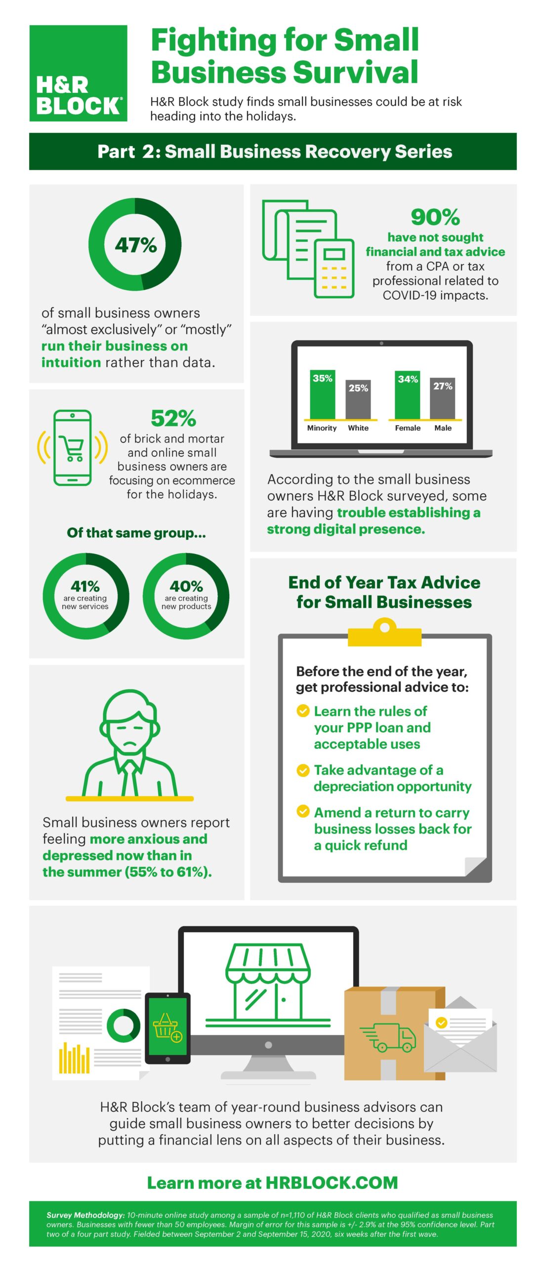 “The most recent findings from our Small Business Recovery Series reinforce a trend we’re seeing where small business owners are focused on regaining lost revenue by offering new products and services, along with growing their e-commerce presence. While this rapid adaptability is key to surviving the pandemic, running on gut instinct instead of data and without professional counsel could put them at increased risk for unanticipated financial and tax implications,” said Jeff Jones, president and CEO of H&R Block.
